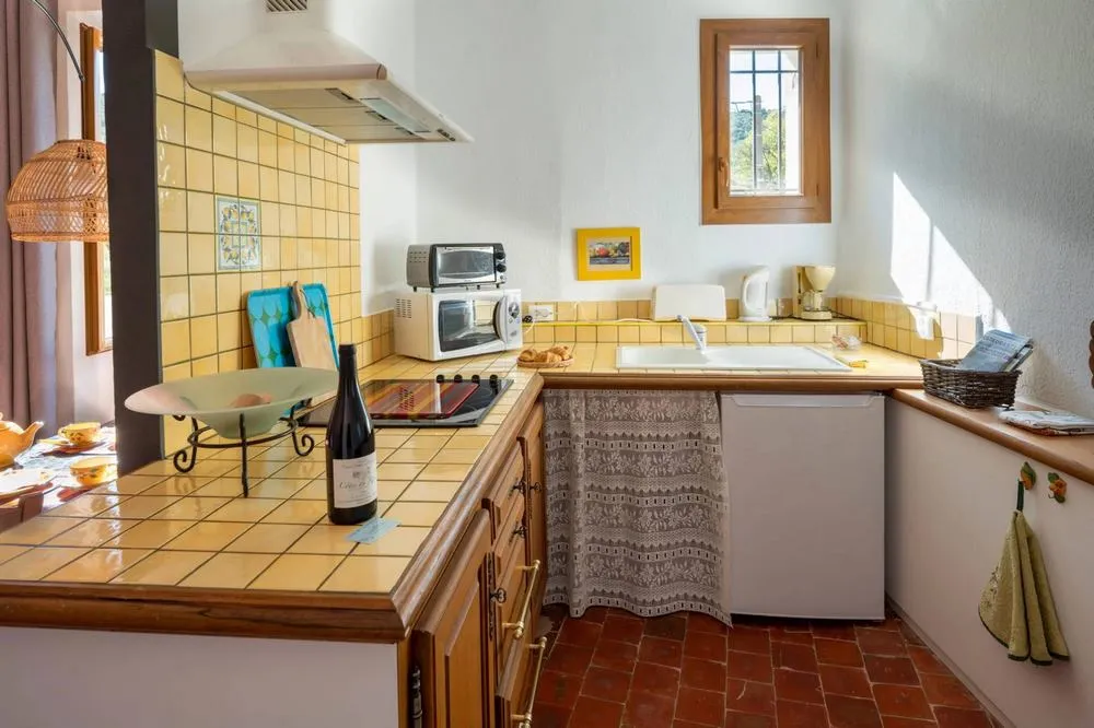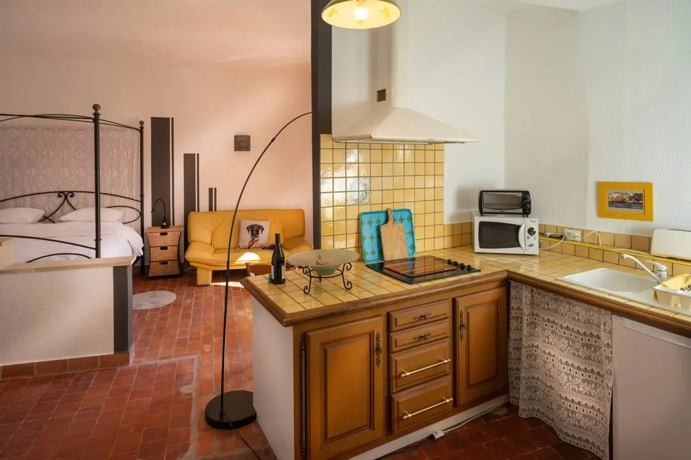 Dans ce gîte, profitez d’une cuisine entièrement équipée, comprenant tout le nécessaire pour préparer vos repas pour 2 personnes. La chambre est dotée d’un grand lit double à baldaquin de 180x200 cm et d’une fenêtre donnant sur les vignes.